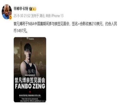 媒體報(bào)道,屆時(shí)NBA中國賽期間,中國球員、籃網(wǎng)前鋒曾凡博將參與親簽見面會(huì)。球迷可以近距離接觸球員,并得到簽名合影,但收費(fèi)高達(dá)210美元,折合人民幣約1500元。