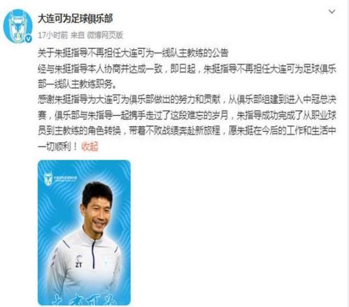 朱挺自宣:由于戰(zhàn)績(jī)不佳,未達(dá)到俱樂部預(yù)期標(biāo)準(zhǔn),經(jīng)與大連可為俱樂部協(xié)商:即日起,本人不再擔(dān)任大連可為俱樂部主教練職位。朱挺寫道:“一同戰(zhàn)斗10輪正式比賽,共6勝4平,有驚喜也有遺憾,更多的是對(duì)自己能力不足的焦急忐忑,未來一定充分學(xué)習(xí),夯實(shí)基礎(chǔ),努力提高業(yè)務(wù)水平,為大連足球做微薄的貢獻(xiàn),少說空話多干事實(shí),用這次寶貴的聯(lián)賽經(jīng)驗(yàn)服務(wù)更多,對(duì)足球有理想有憧憬的球員!”